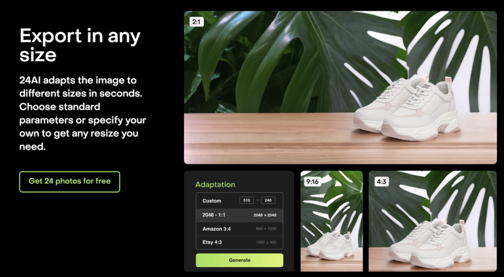 With 24AI, you can easily choose the perfect background for your product. Just provide a brief description of your desired background, and the platform will generate an endless list of solutions for you to choose from. It’s that simple!