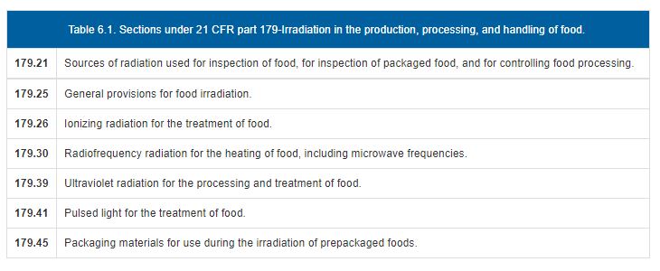 21 CFR 179 is the primary regulation that covers irradiation in the production, processing, and handling of food, and it is divided into subparts and sections, as shown in Table 6.1. Subpart B describes radiation and radiation sources, which include gamma-ray, e-beam, and X-ray, as well as the general provisions for food irradiation. Subpart B also lists other radiation processes, including radiofrequency radiation, ultraviolet, and pulsed light. These radiation processes are covered elsewhere and will not be included in this chapter. Subpart C describes packaging materials for irradiated foods. The listing regulations in Part 179 are the result of approvals through the food additive petition process codified in 21 CFR 171.