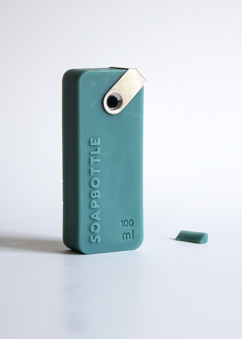 These bottles, which she calls SOAPBOTTLE, are created from a traditional piece of soap hollowed out. The interior is marked with a water-insoluble layer, which stops any liquids included within it from melting the soap. There is a reusable metal finish on the cover to allow you to open the lid and pour out your shampoo or shower gel.